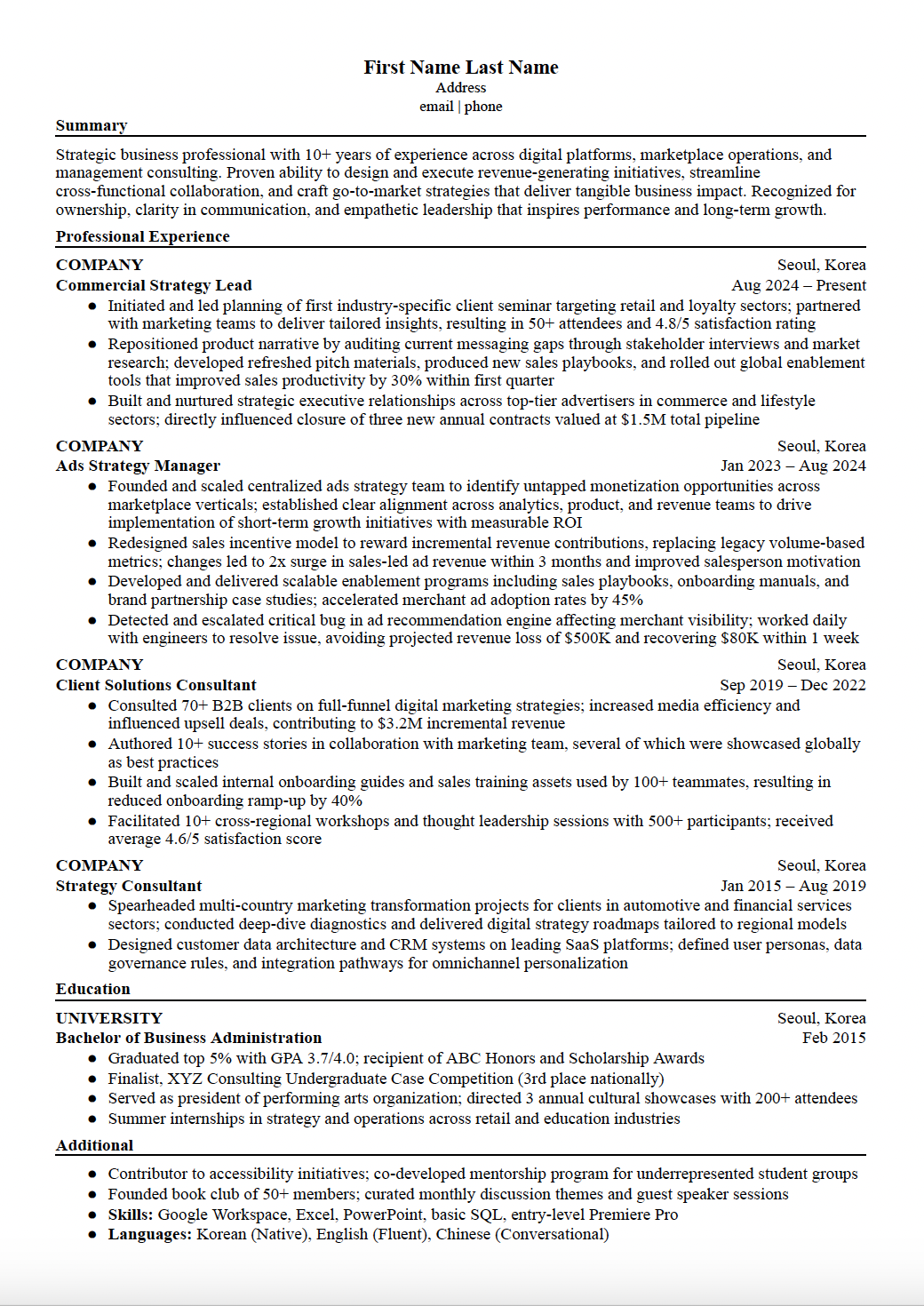 | Additional | 언어, 자격증, 기술 등 추가 정보 | 5~10% |